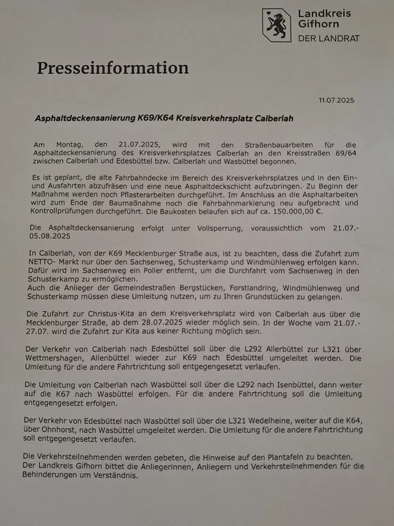 Am Montag, dem 21. Juli 2025 wird mit der Sanierung vom Kreisel am Netto-Markt begonnen. Geplant ist der Abschluss der Maßnahme am 5. August. Es ist mit Verkehrsbehinderungen in alle Richtungen zu rechnen.